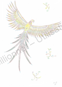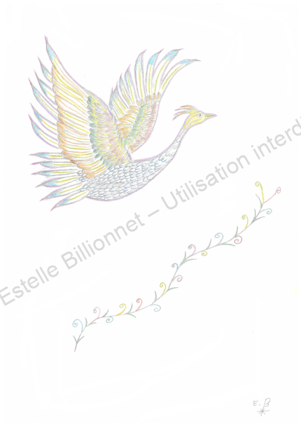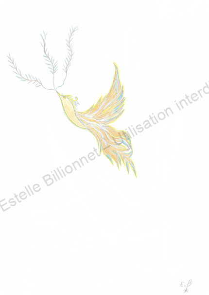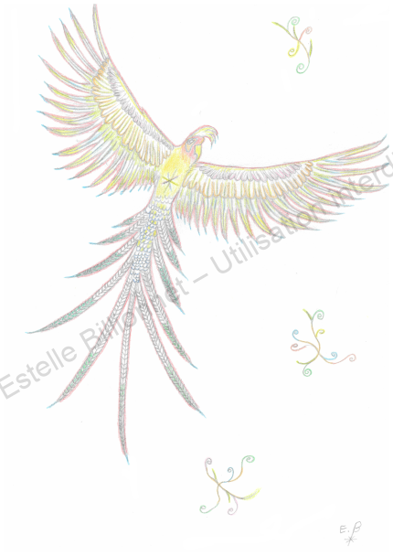 Cet oiseau aux couleurs chaudes, s’inspire du Phénix et de la colombe.